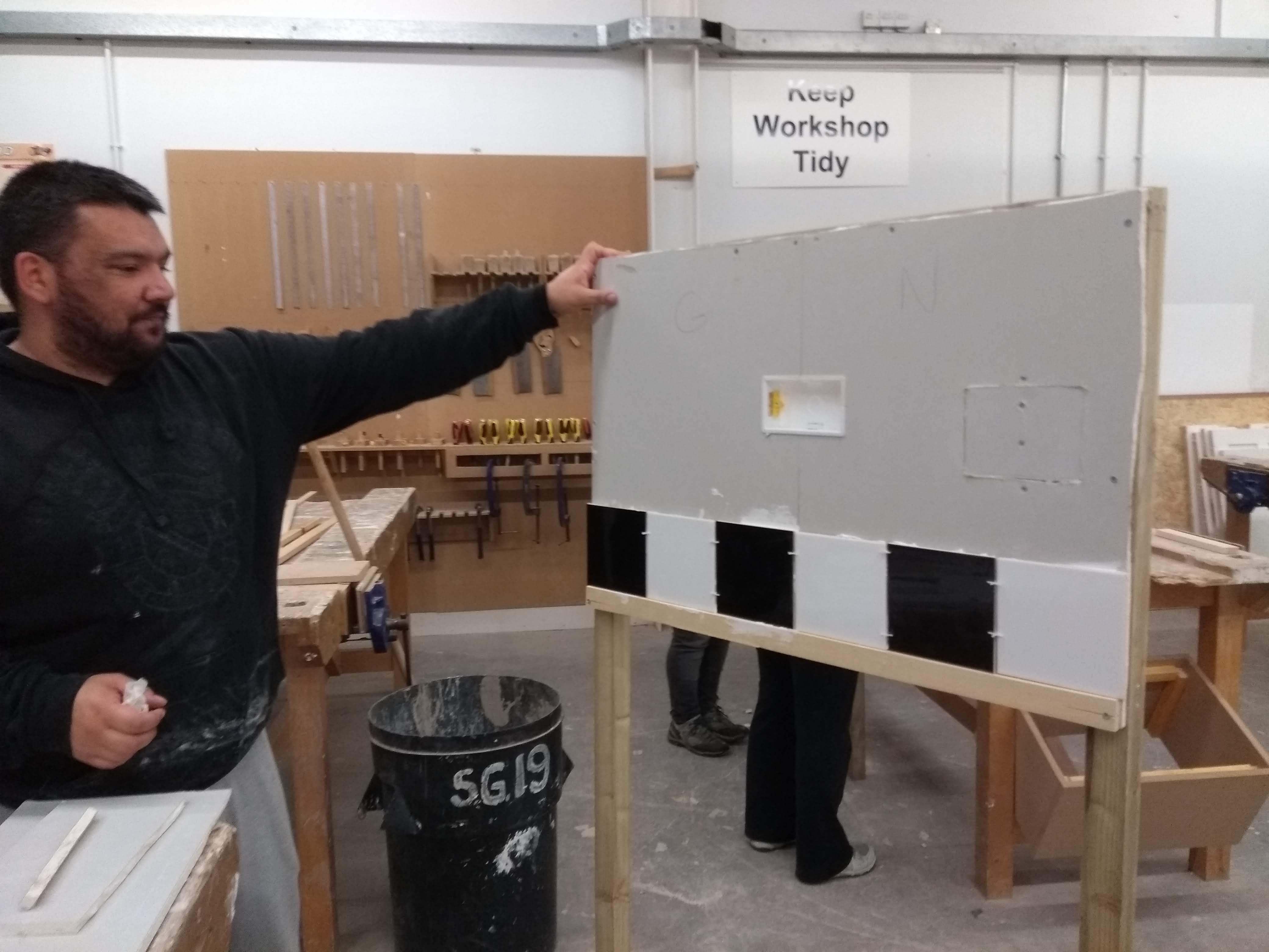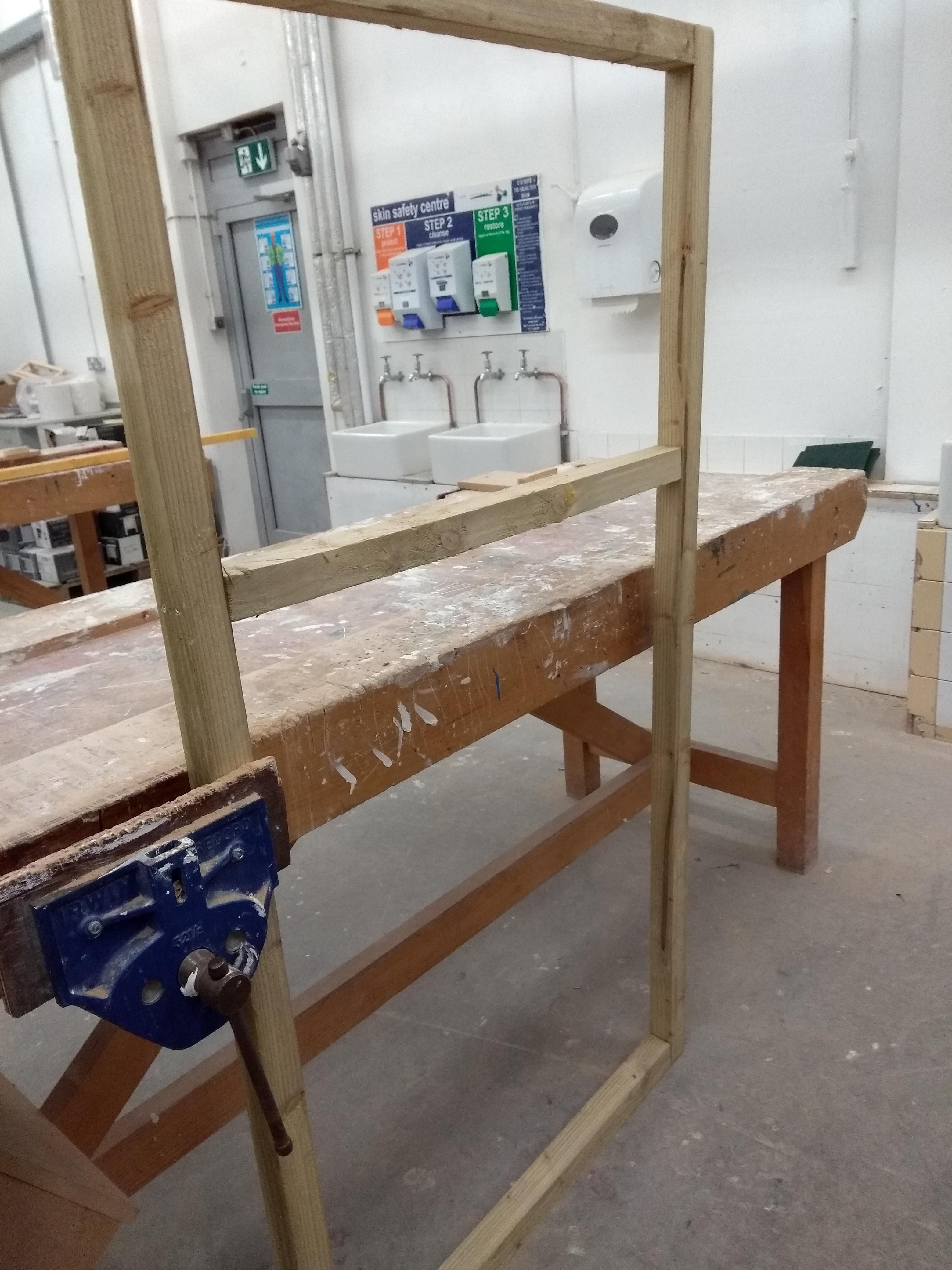 - Put the frame in a vice, screw gyprock in - make sure the screw heads are past the gyprock, it needs to be flat